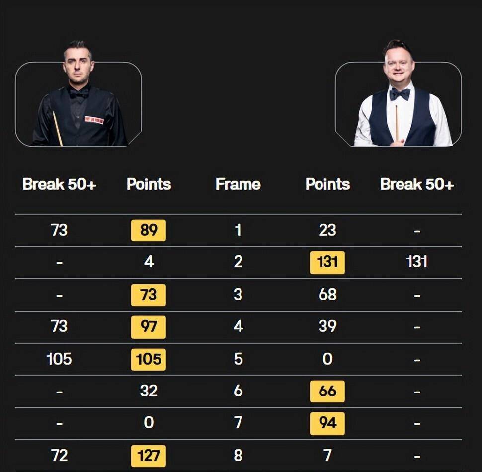 中场休息前,塞尔比3比1领先。 休息回来后,他更是手热得发烫,第五局直接一杆105分破百,把比分拉开到4比1。 尽管墨菲顽强地连追两局,将比分迫近到3比4,但塞尔比在关键时刻毫不手软。 第八局单杆72分拿到赛点,第九局更是用一杆127分的干净利落的破百,彻底终结比赛悬念。 6比3,塞尔比昂首挺进决赛。